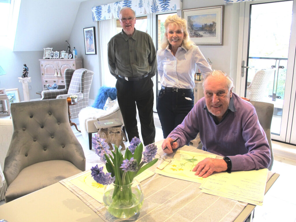 The Woodland Trust and the Clarence Bicknell Association announce a campaign to raise funds for the Woodland Trust from the sale of celebrity-signed prints of flower watercolours by the Victorian polymath, botanist and artist Clarence Bicknell. Our photos shows celebrities signing a limited number of the pictures novelist Frederick Forsyth in the company of supporter Sally Harrison and Marcus Bicknell, the great-great-grand-nephew of Clarence and singer-songwriter Chris de Burgh.