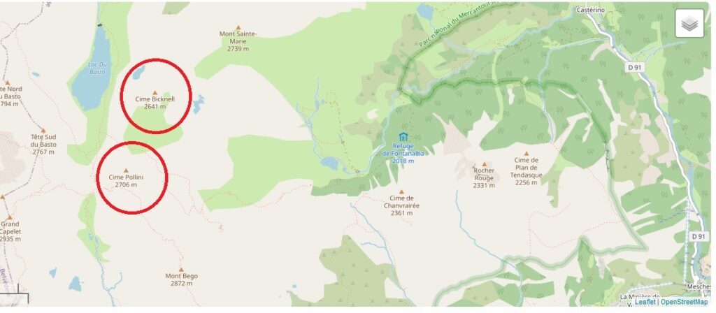 It is not known who attributed the name Pollini to the Cima Pollini, next to the Cima Bicknell above the Val Fontanalbe in the Massif de Mercantour. In the seven years of research by Valerie Lester, Susie and Marcus Bicknell, no record was found of the naming of this mountain. Cima Bicknell was mentioned in CAI journal (Italian Alpine Club) and Fritz Mader was the source, but we could not find Cima Pollini.