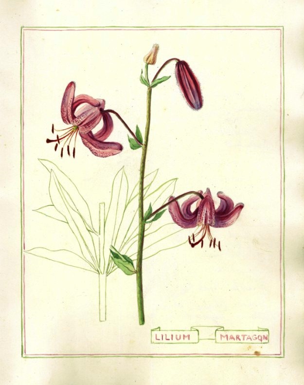Firstly in the Casa Fontanalba Visitors’ Book (Bicknell Collection) which he drew in 1906; every right hand page has a glorious watercolour of a wild plant, here Martagon Lily, and guests signed on the left when visiting his summer home in Casterino in the mountains above Bordighera. Clarence died when the book had about 320 signatures of famous archaeologists, botanists, writers, Esperantists, soldiers and politicians, as well as friends and family. Buy a copy old.clarencebicknell.com/shop.