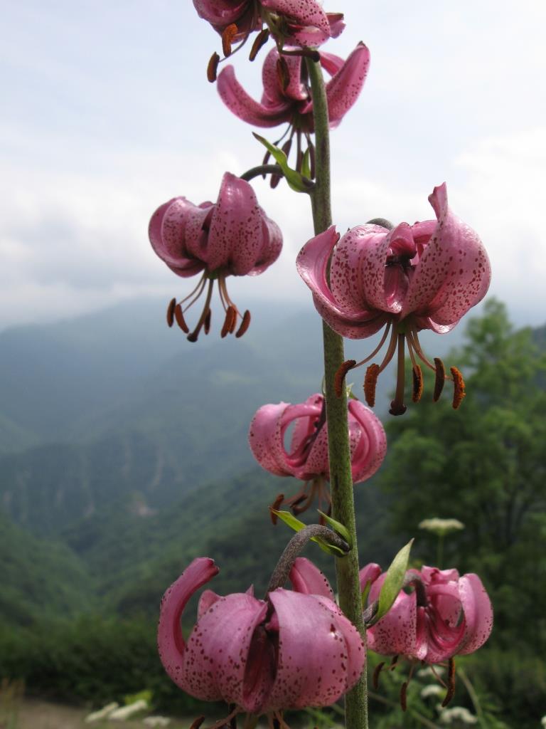 Lilium martagon L. (Italian, Giglio martagone or riccio di dama; English, Martagon lily (or Turk’s cap); French, Lis martagon) grows wild in the Italian and French Alps up to 2000 metres altitude in open woods,  grasslands and clearings. Each plant is up to 1.5 metres high, is in bloom from June to July; one head can display from 4 to over 20 flowers, each with six purple-red tepals with dark small dots, each bent backwards. Family of Liliaceae.