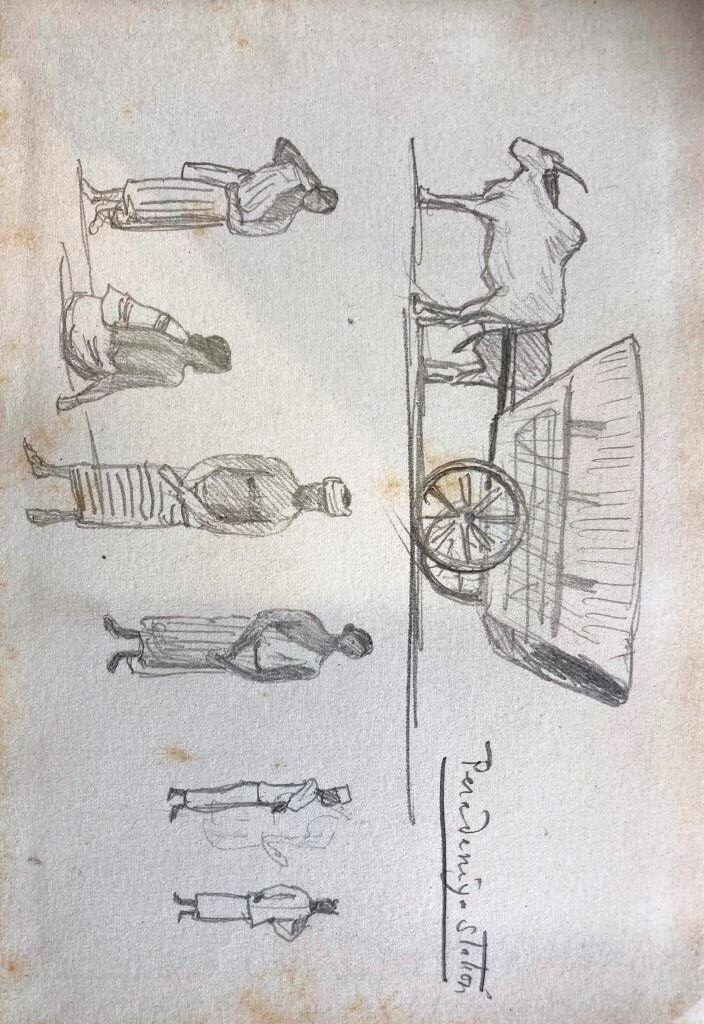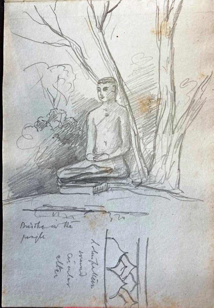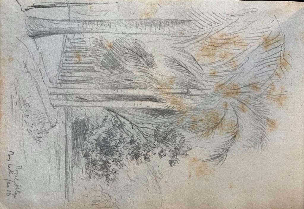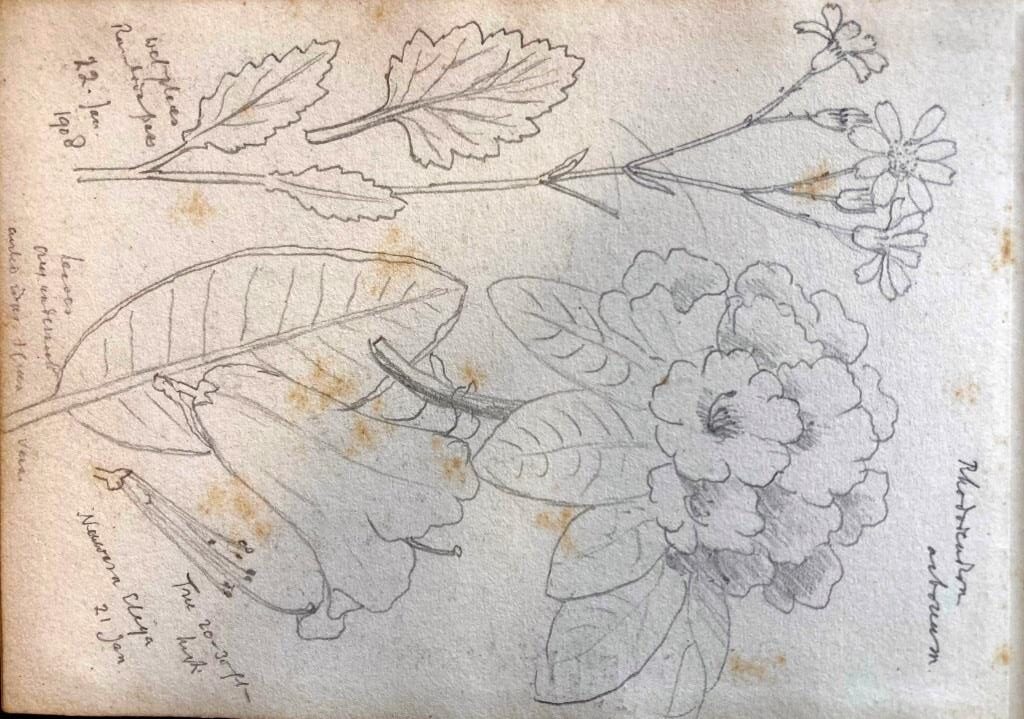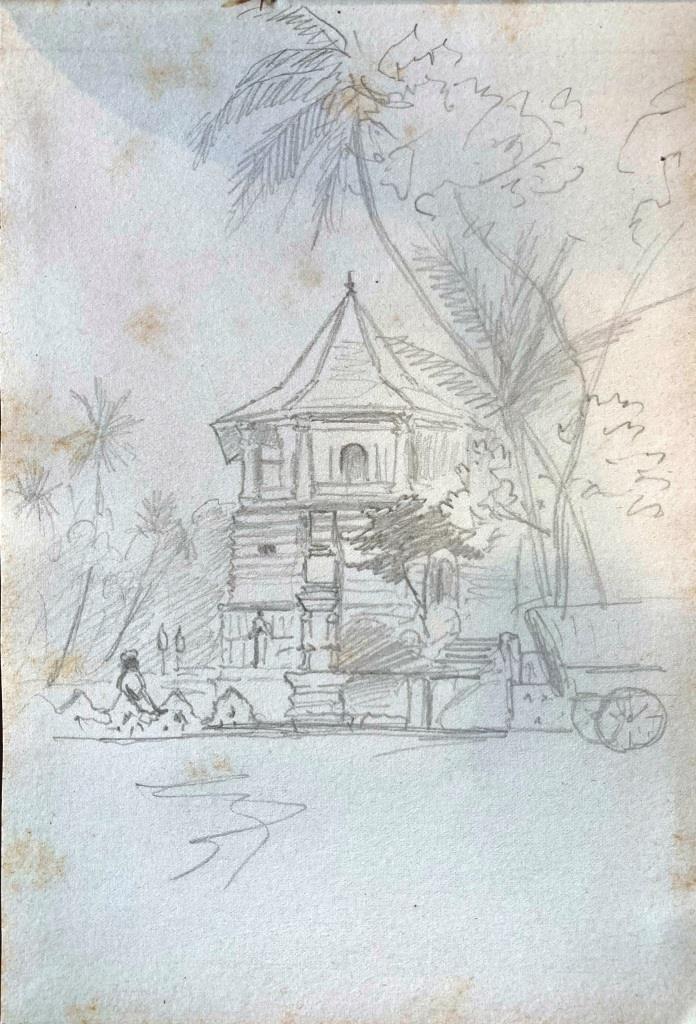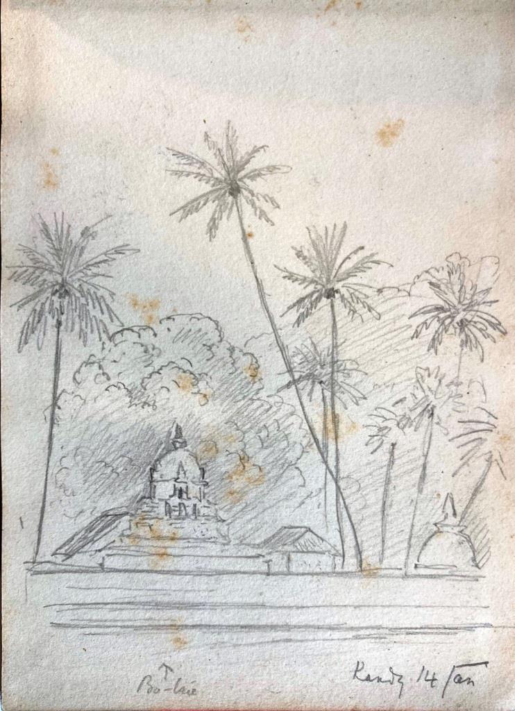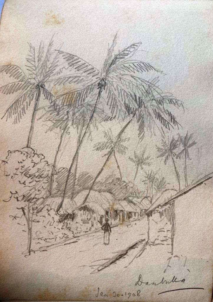 I have looked through the catalogue of our collection of Clarence’s paintings and sketches and am pleased to say I have found the small (15×10 cms) sketch book he used during his visit to Sri Lanka. There are about 30 rough sketches of flora he took an interest in, not of great quality; he is sketching them to record them for later study, as he often did. The sketches of people and places are quite interesting. I have sent a dozen photos in high resolution to you using WeTransfer; you should have a separate email with a link. Note that some of the sketches are dated Jan 1907 but this is an error by Clarence each time; he was there in Jan 1908. We hereby authorise you to use these images in your work and publications, with pleasure.