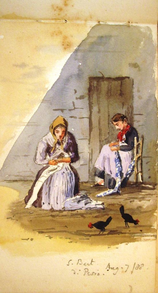 St. Bartolemo di Pesio ladies and hens, another watercolour by Clarence Bicknell, loose leaf on cartridge paper, also shown here, was drawn on 7th August 1888. That is 6 weeks after the drawing in Terme d’Acqui, so his mountain sejourn for health reasons might have taken a couple of months.