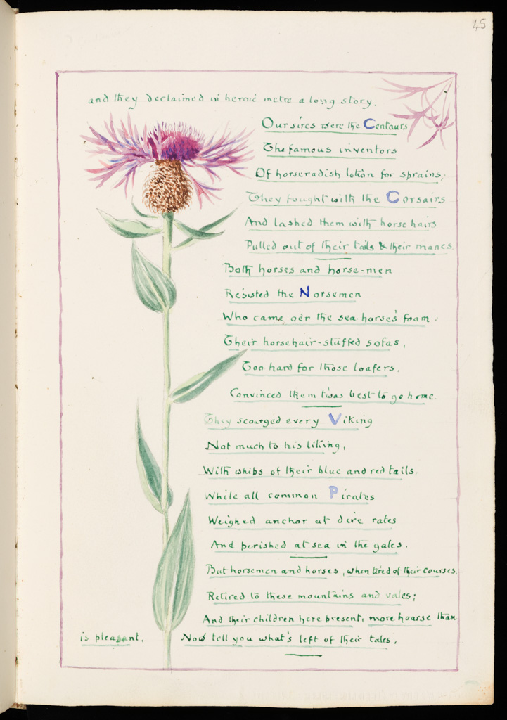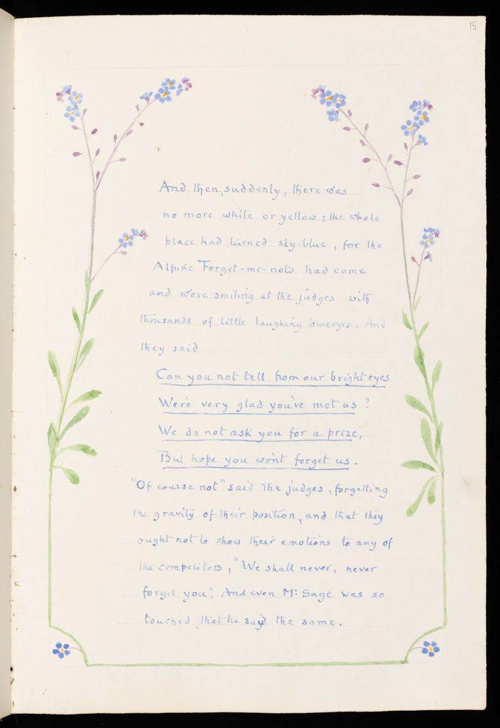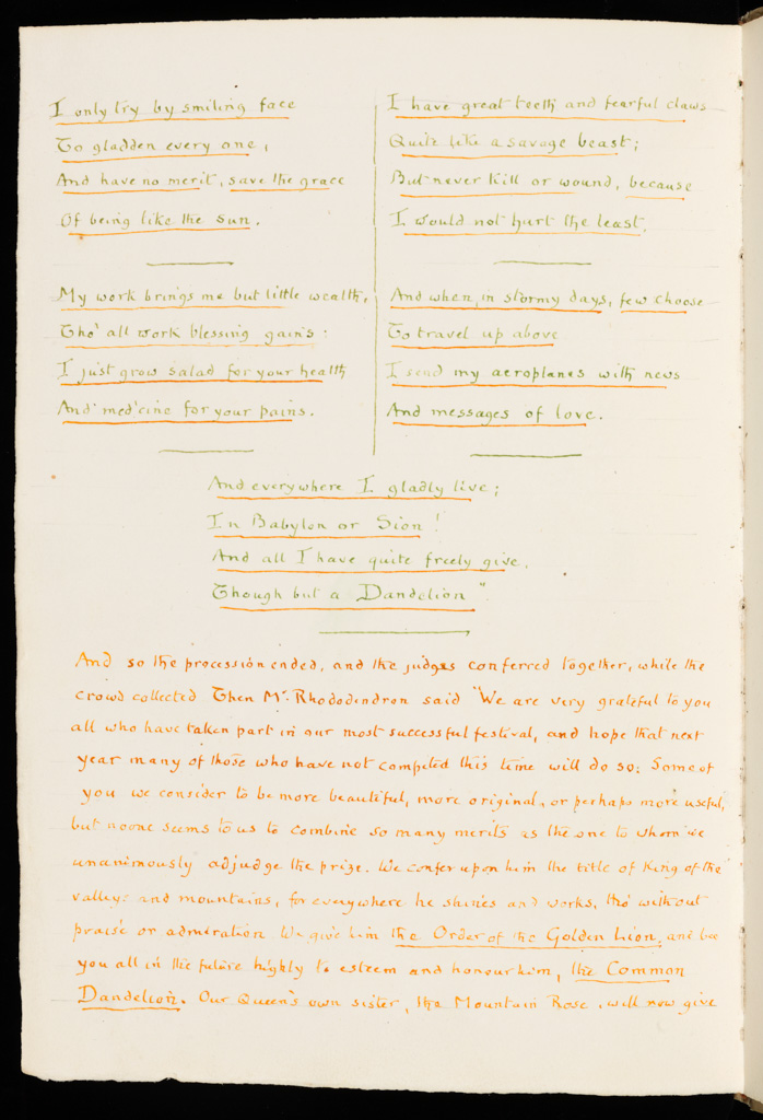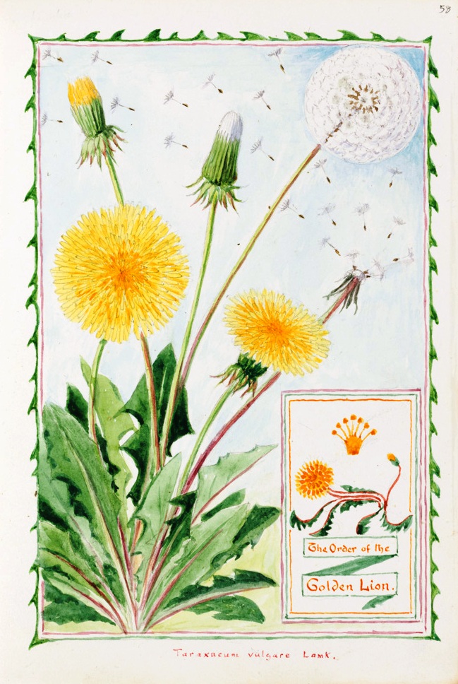 2. The Triumph of the Dandelion. This album contains a procession of the flowers of Fontanalba to celebrate the coronation of King George V in 1911; the last watercolour page, dated 1914, is an elaborate fantasy “The Triumph of the Dandelion” in which flowers compete to win “The Order of the Golden Lion”. Page by page each flower presents its claim to the prize in drawings, prose and verse. Because Clarence championed the simple wild flowers, not cultivated garden flowers, the common dandelion won the contest. In the bottom right hand corner of the final piece of the album, the stalk, leaves and flower of the dandelion are shaped into the body, legs and head of the Lion. The association in Clarence’s mind of the Dandelion (from the French “dent de lion”, lion’s tooth, because of the coarsely toothed leaves) with the Golden Lion trophy is charming. For many admirers of his work, this page is a triumph in itself.