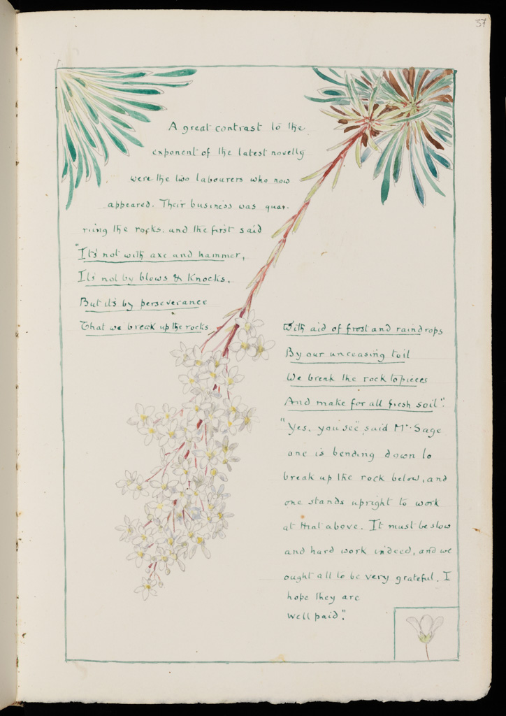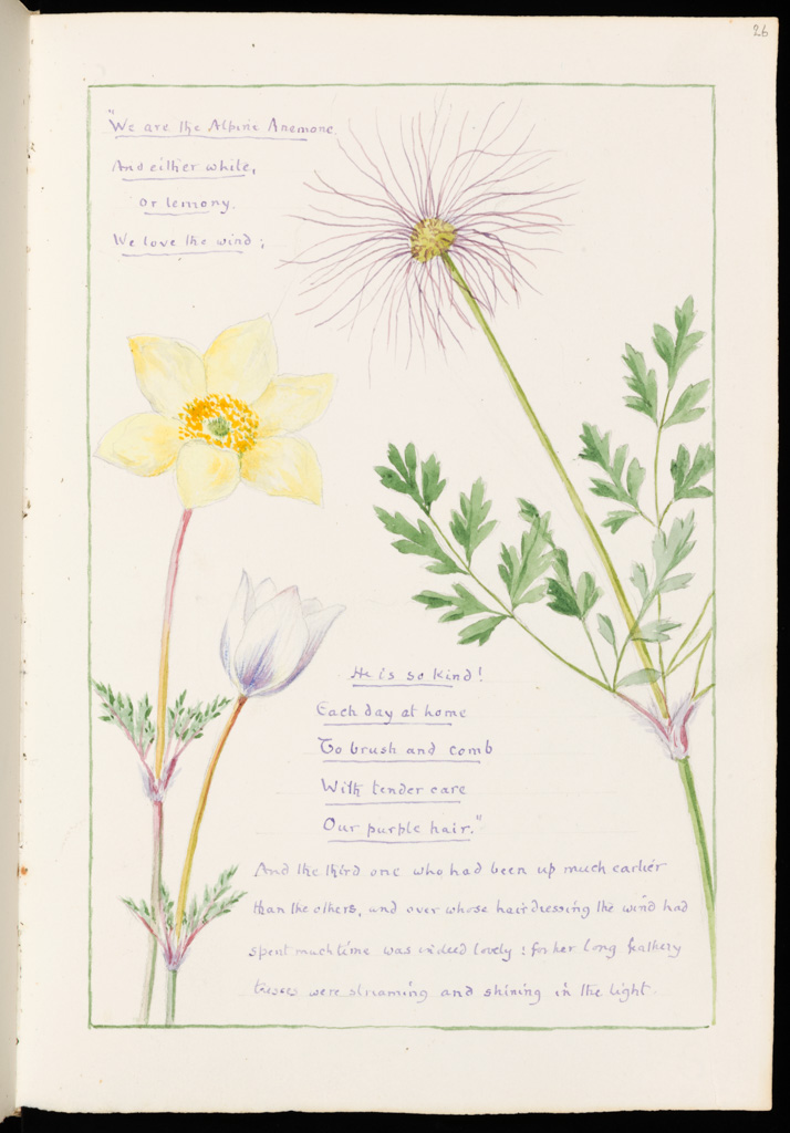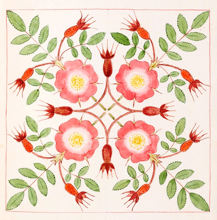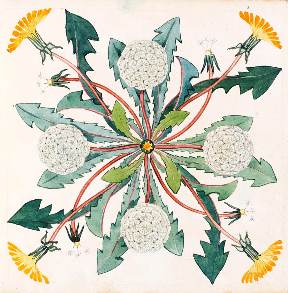 Works such as The Triumph of the Dandelion (1914) take on this latter quality, bearing affinities to the eccentric style of Lewis Carroll, as it lauds the properties of Bicknell’s favourite wildflower. Executed in watercolour in a vellum sketchbook, it is a book which merges story-telling, poetry and painting in a manuscript-like compendium. It was also a gift to his friend, Margaret Berry, who would provide him with empty drawing albums each year from the late 1890s, which he would gradually fill and give back to her. Rhyming couplets accompany the floral motifs and, in this way, it reveals fantasy merged with a supreme interest in nature and the natural world. The Triumph of the Dandelion appears to take Crane’s Flora’s Feast and A Floral Fantasy in an Old English Garden as a starting point, merging text and illustration to construct child-like ensembles. An earlier sketchbook on display alongside The Triumph of the Dandelion is less eccentric. In the Wild Flowers of Fontanalba (1908) Bicknell moves away from stringent botanical accuracy, but drawings like Rosa Pendulina are decorative and symmetrical. Marcus and his wife Susie suggest Bicknell may have used mathematical instruments in the creation of such drawings, referring to the “kaleidoscopic effect”.
