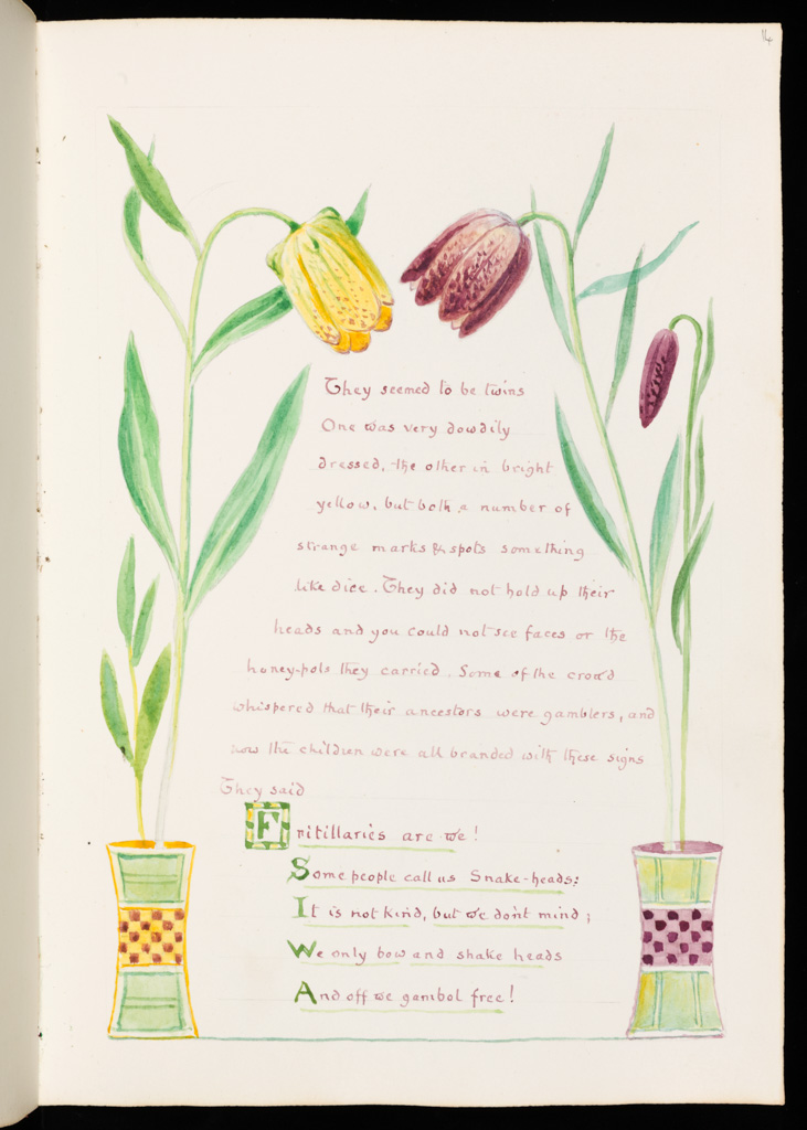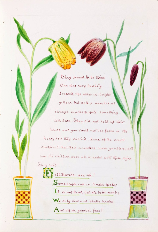 Some of the most startling and innovative Clarence Bicknell’s creations are in the seven albums in the Fitzwilliam Museum, University of Cambridge. Peter Bicknell, Marcus’s uncle, donated the vellum-bound albums to the museum in 1980, comprise 405 pages of watercolour paintings, many of them photographed and available for us to enjoy. The books encapsulate the last stage of Clarence’s artistic journey from rigorous botanical recording of the late 1870s through the floral decorations of the Casa Fontanalba Visitors’ Book to these idiosyncratic arts and crafts creations full of wit and whimsy. The Fitzwilliam has generously allowed us to reproduce (but not in the original high definition) these extraordinary images; they are so popular that reproductions of them as greetings cards and other merchandising are best-sellers in the museum shop and around Britain. Read more below the picture gallery…