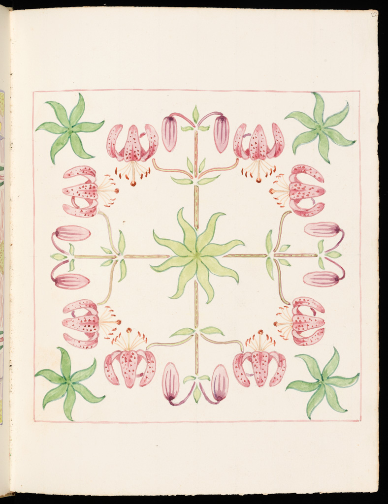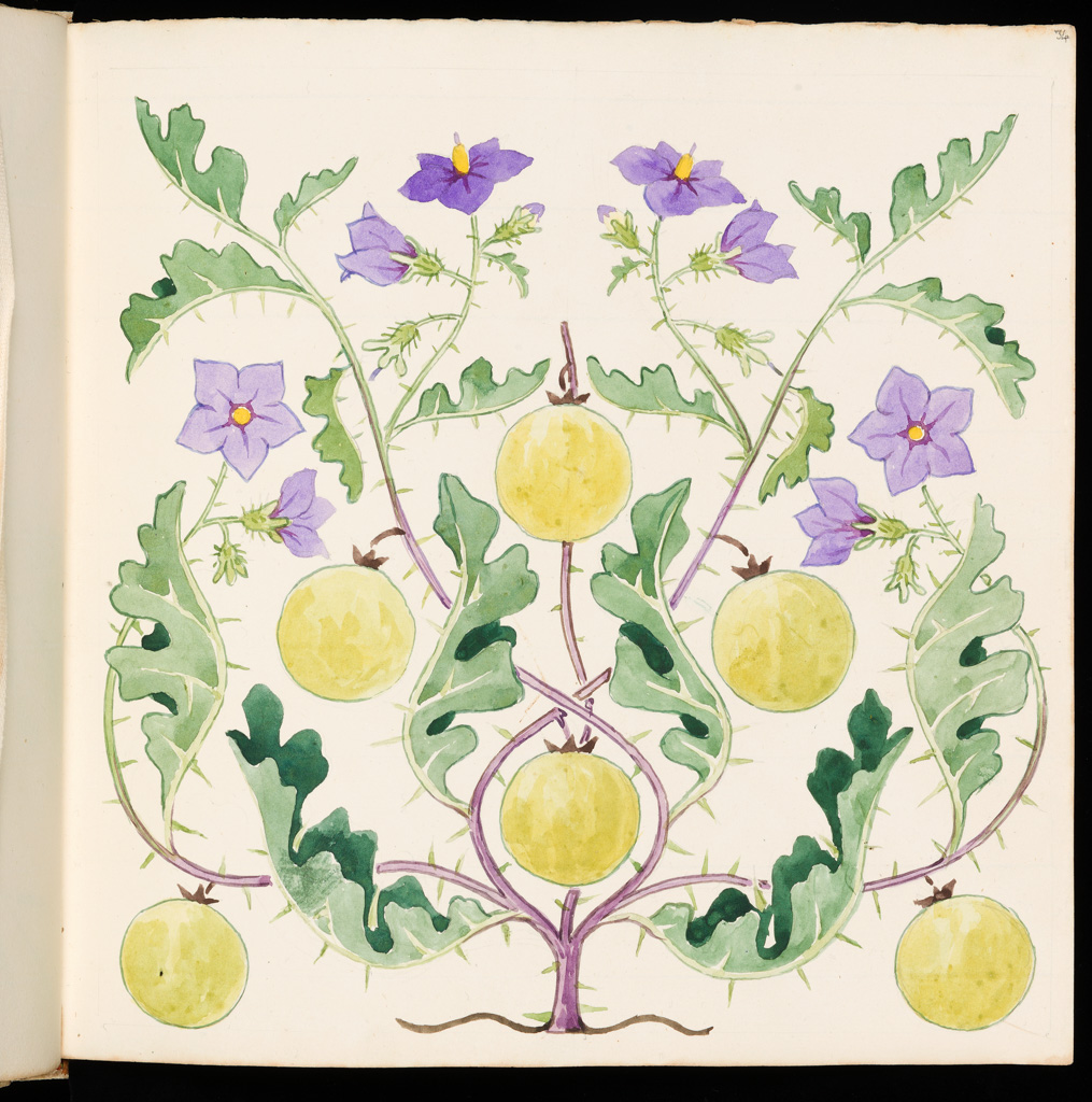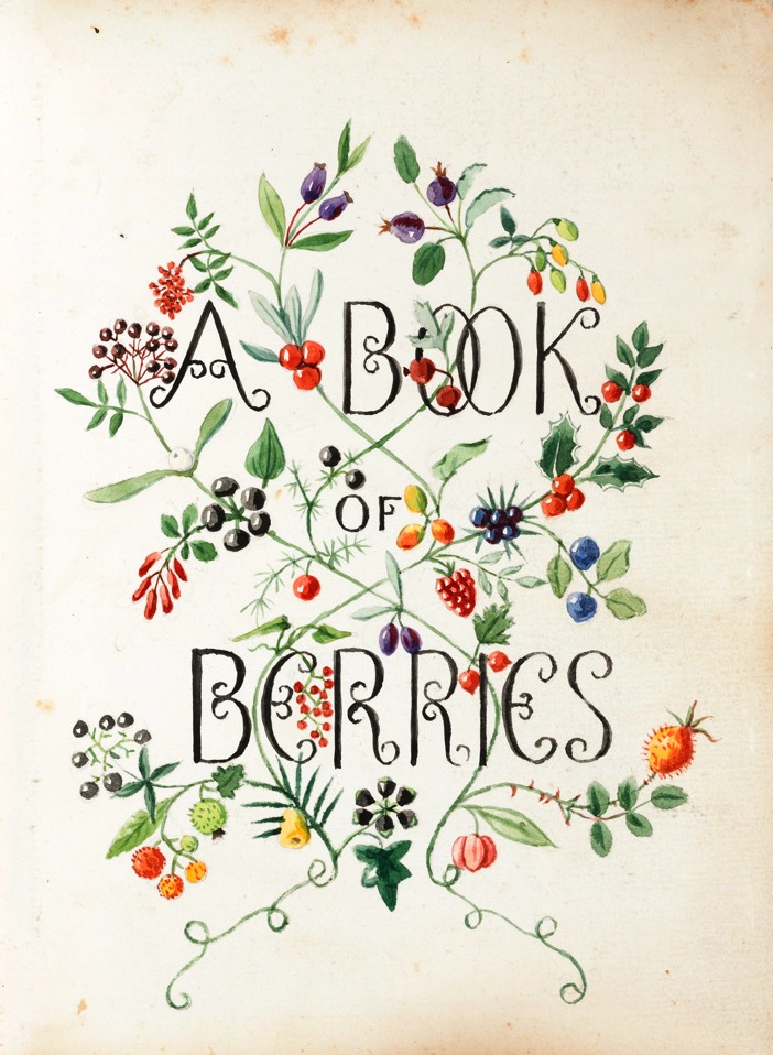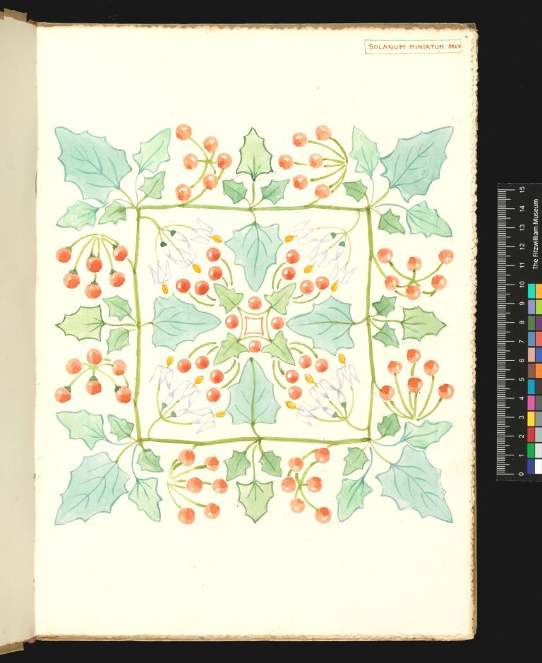 1. Sketchbook. A Book of Berries. 1908. Clarence loved word plays. The “Berries” were not just the small, pulpy, and often edible fruit in the design but also his nephew Edward Berry and his wife Margaret who also lived in Bordighera and were a vital part of his team. It was she who bought a blank album every year for Clarence. He filled each with floral designs and often returned it to her as a gift. This album contains mostly symmetrical floral creations.