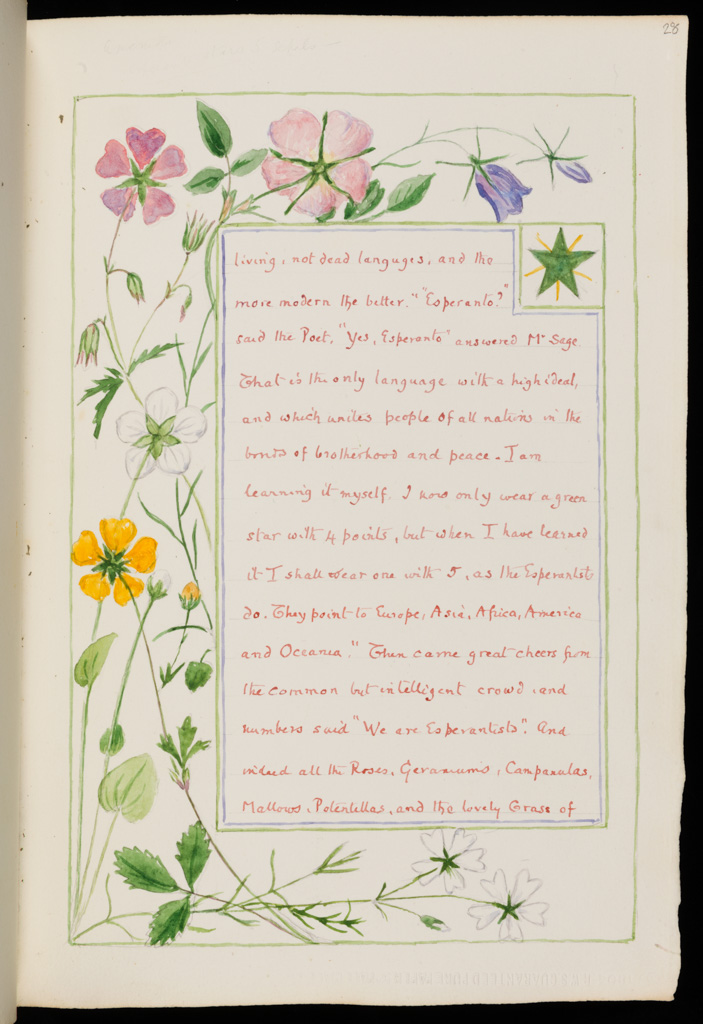 Marcus hints at some form of memory loss in Clarence, explaining why he began to abandon principles of mathematics and empiricism and began to dabble with fantasy and invention. Bicknell’s Arts and Crafts “masterpiece”, his Casa Fontanalba up in the mountains of Bordighera, symbolises such eccentricity. As the Fitzwilliam exhibition notes, Bicknell decorated and inscribed his house with drawings of flowers relevant to each room; the cook’s room, for example, was adorned with illustrations of raspberries, gooseberries, strawberries and wild spinach. Inscriptions in Esperanto also feature on the walls, and the names of all his guests who stayed were recorded by Bicknell himself over the house.