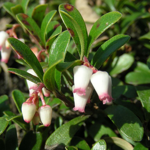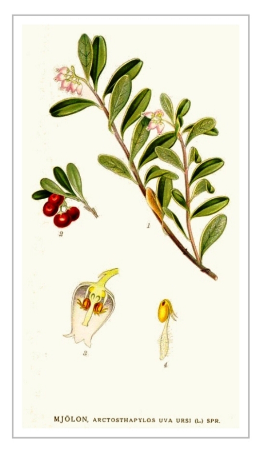 The flower used by Clarence in this design is Arctostaphylos uva-ursi L., Bearberry in English, Uva ursina in Italian. Family: Ericaceae. Found at high altitudes of Europe and also in North America and Asia. In the Alps grows both in siliceous and calcareous soils in open stoney areas. The plant is low (max 25 cm) with a creeping stem. Leaves collected in late Summer are used by herbalists as a diuretic ingredient. Flowering in late spring. Little waxy flowers white and pink in clusters. The little red berries are said to be greatly loved by bears, hence the name Bearberry.