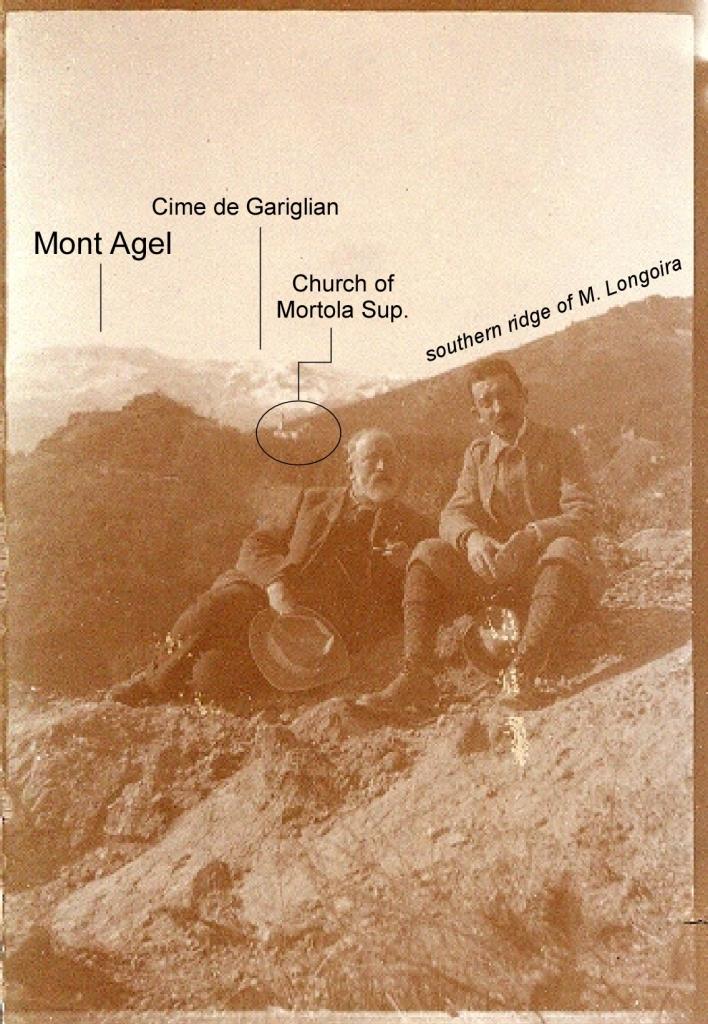 “Here is an annotated version of the photograph. The church of Mortola Superiore and the woody hill to its left is quite well recognizable. I do not think the sea to be actually visible in the image, (the furthest thing visible is the snowy Mont Agel ridge), though the shooting point is actually very close to the sea, just a few hundred metres as the crow flies.”
